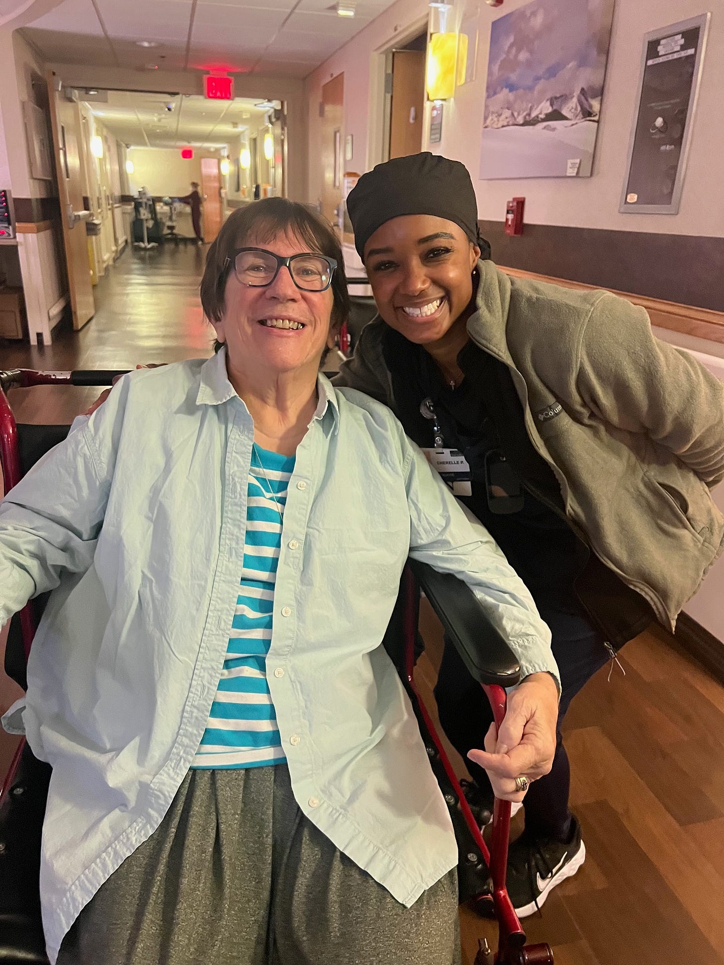 On the morning of my mom’s release, I felt like we were breaking out of the place. I was all business while my mom was all smiles, filling the stale room with colorful thank-yous and I’m-gonna-miss-yous. The sort of verbal emojis she’s so good at. She insisted I take a photo of her with her favorite nurse, Cherelle. I relaxed for a moment to indulge her.