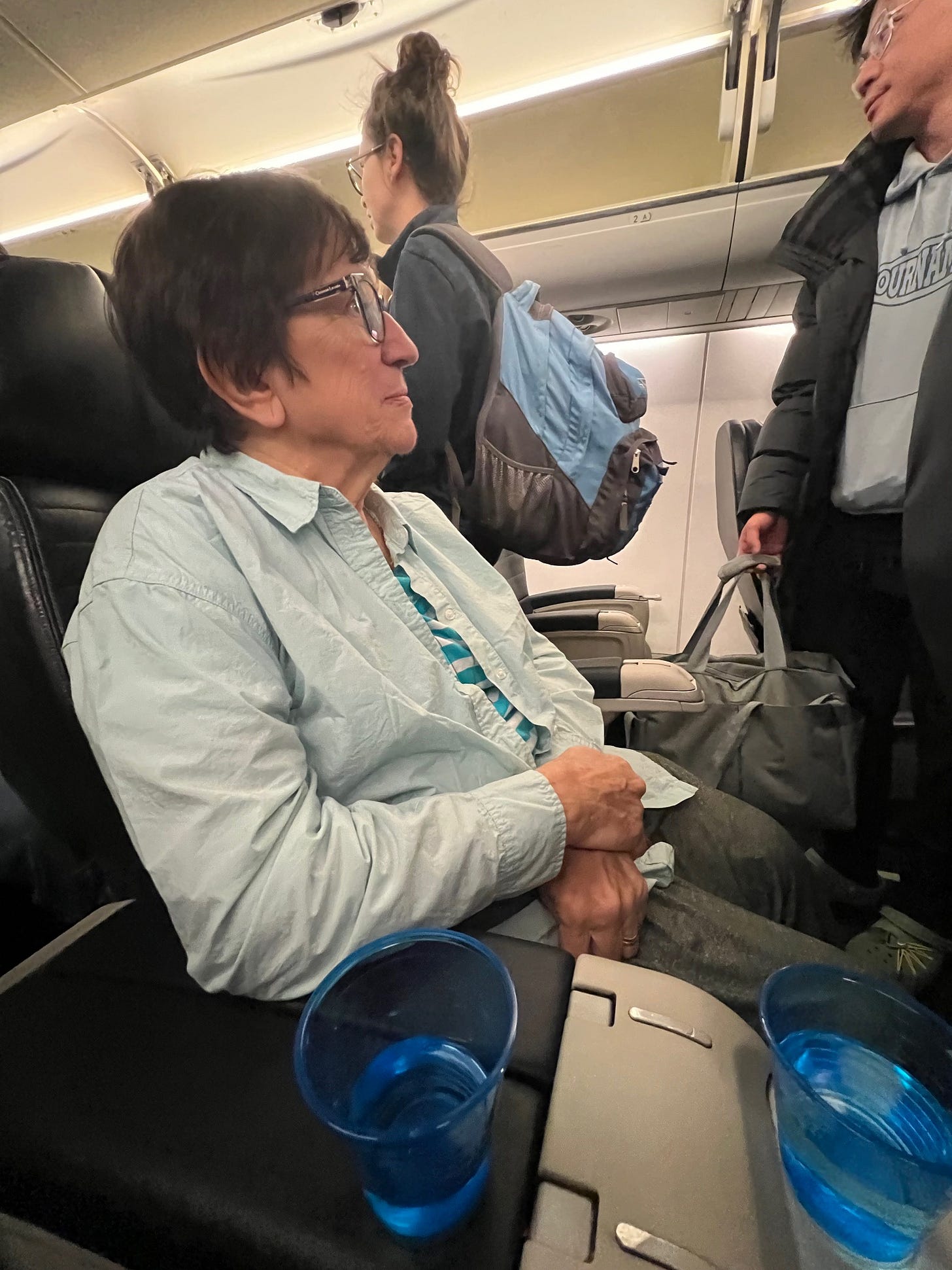 Once she was standing, my sister quickly swapped the hospital transport wheelchair with the United Airlines chair. I then asked my mom if she was ready to ease down. I lowered my squat until her legs felt the chair meeting her body. She loosened her grip around my neck, let out a big sigh, and gave her weight over to sit. I released my hold as she scooted around to settle in. “I did it!” she said, looking at all of use for some recognition. We were all too focused, or perhaps relieved, to offer much.