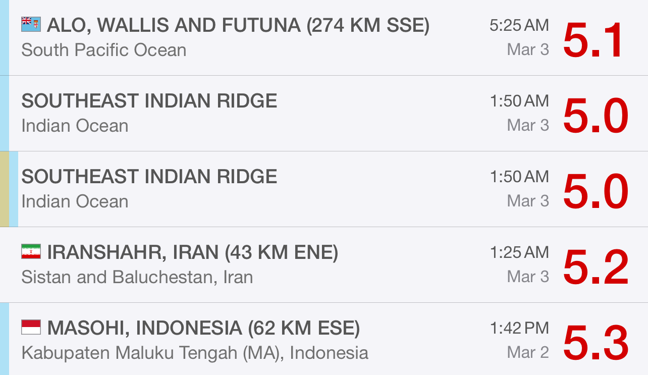 As I write this essay in the morning hours of March 3rd, my earthquake app dings. A 5.0 just hit the coast of Peru, near Lima. And a few hours before that there was a 5.1 about 250 miles southeast of the island district of Alo, Wallis and Futuna, a French territory in the South Pacific.